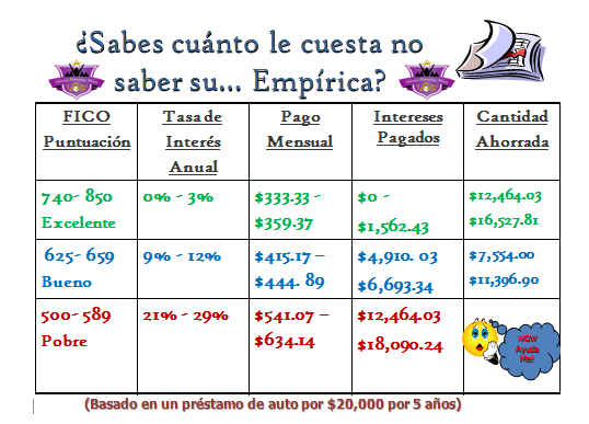 Supongamos que sabes que tienes un buen crédito, pero no sabes su empírica. Vas al “dealer” de automóvil y le dices al vendedor/a, quiero un automóvil con su mejor interés. El vendedor/a te dice, perfecto, vamos a necesitar verificar su reporte de crédito. Cuando te sientan en el departamento de financiamiento, El/La Gerente, te puede decir: sabes, tienes buen crédito pero lo mejor que te puedo dar de interés es un 3%”, y como NO acostumbra saber su Empírica a la hora de comprar, te costará $1,562.43 de interés en vez de $0.